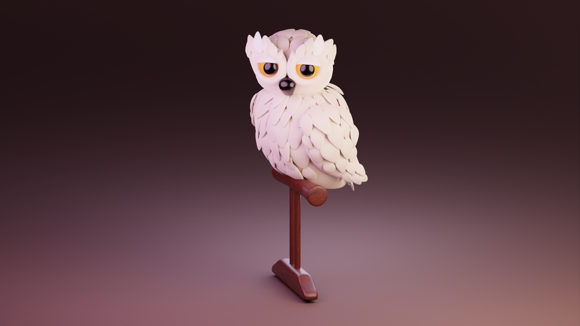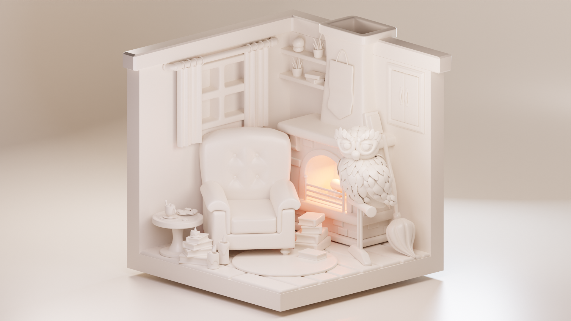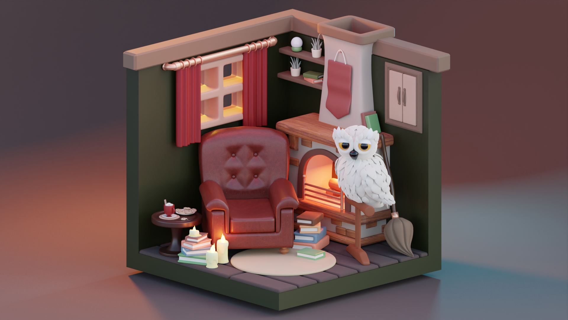 I used oversized elements to create a cramped and cosy feel to the scene, ensuring the owl felt like the guardian of the space. A blend of library assets and custom made assets were used to fill out the space.